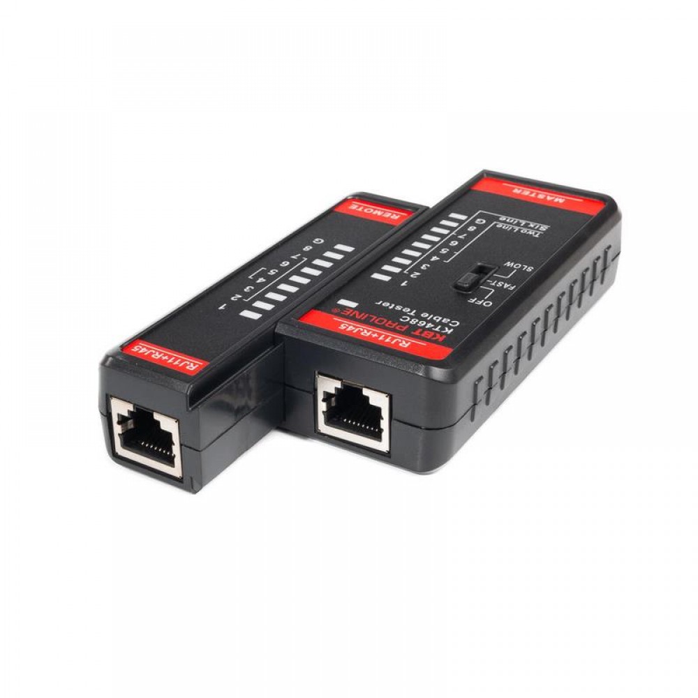 • Тестер для проверки витой пары и телефонного кабеля с возможностью обнаружения обрыва и короткого замыкания, правильности обжима и целостности экрана витой пары, а также для устранения неполадок в перекрестных сетях